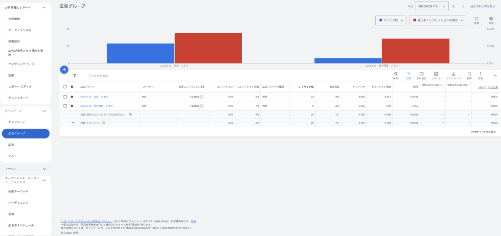 入札戦略の調整で配信の安定化(予算が消化されている、最上位インプレッションシェア35%以上)を行う