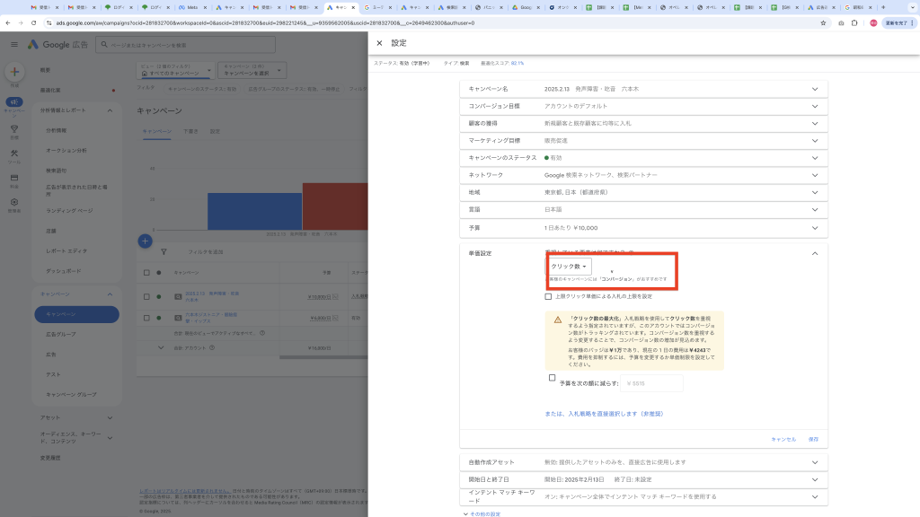 入札単価を20%上げても配信が安定していない場合は、入札戦略の変更(コンバージョン数の最大化) をする