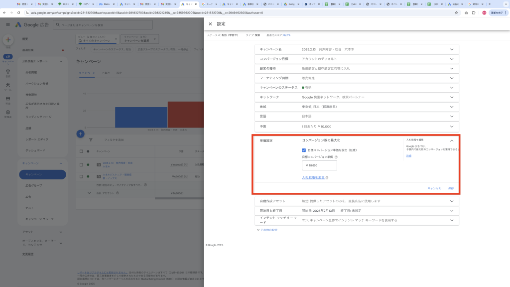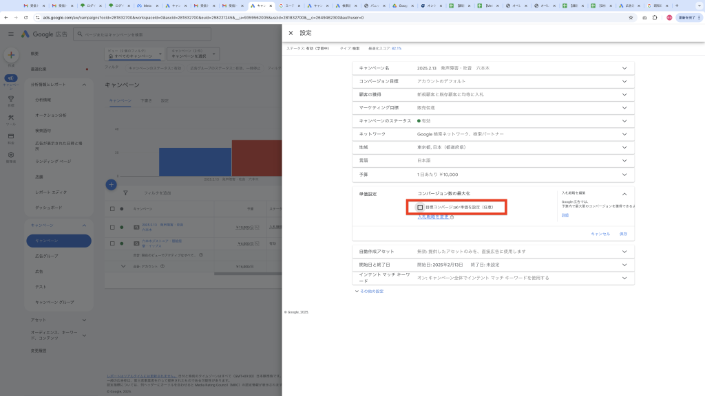 ※目標コンバージョン単価を設定のチェックボックスを外す