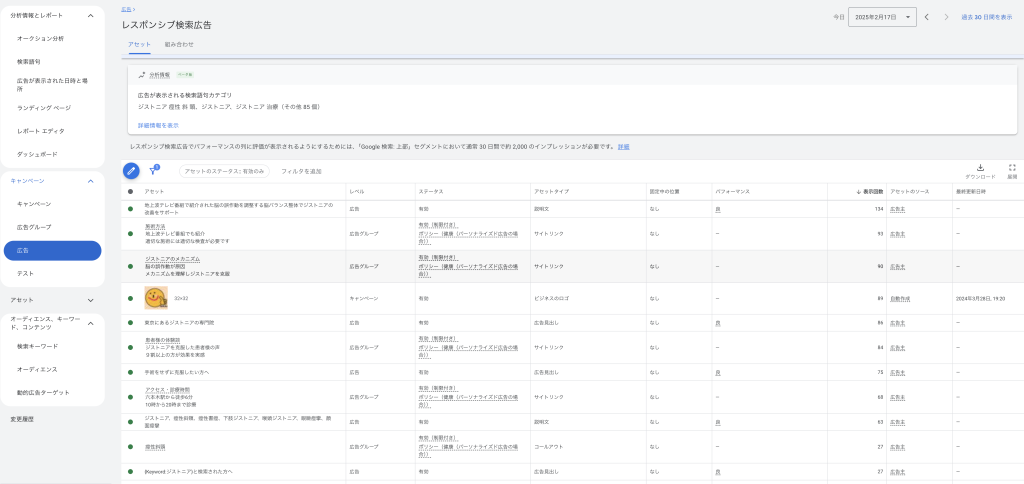 ③キャンペーン→広告→広告アセットの詳細表示から、表示回数が相対的に少ない、または(良)以外を優先的に変更していく