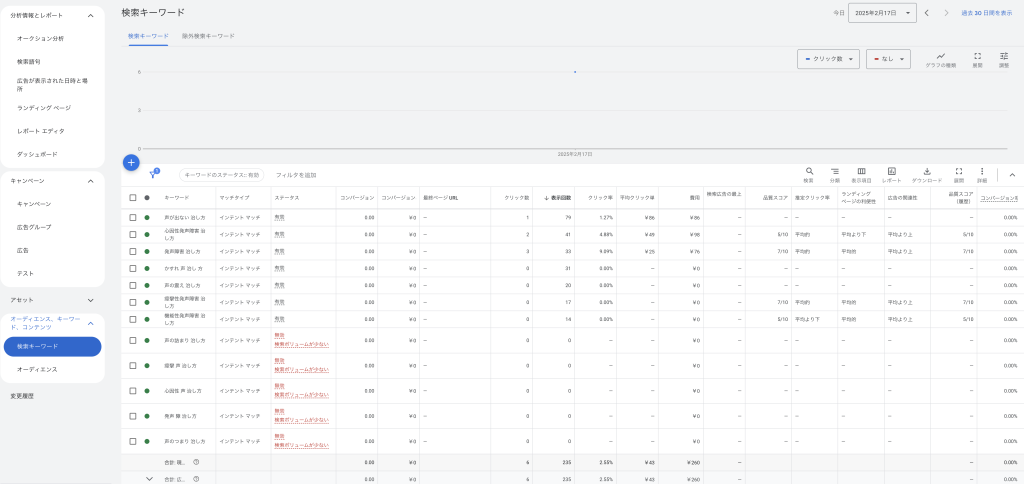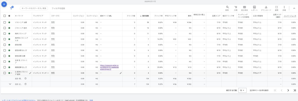 入稿したキーワードの広告の関連性が【平均より下】の場合は、キーワードを一時停止にするか、コンバジョンにつながる可能性が高いキーワードだった場合は、広告アセット(広告見出し・説明文)に追加して広告の関連性を上げる