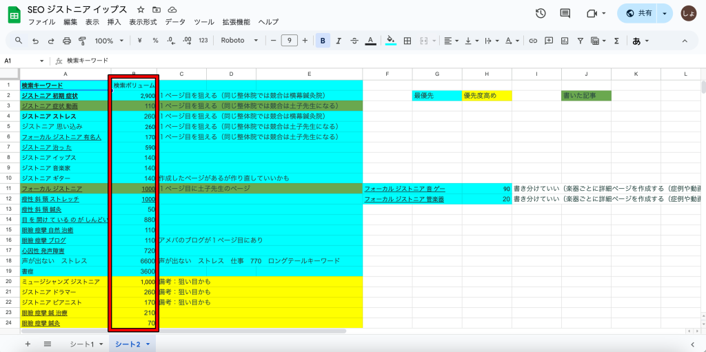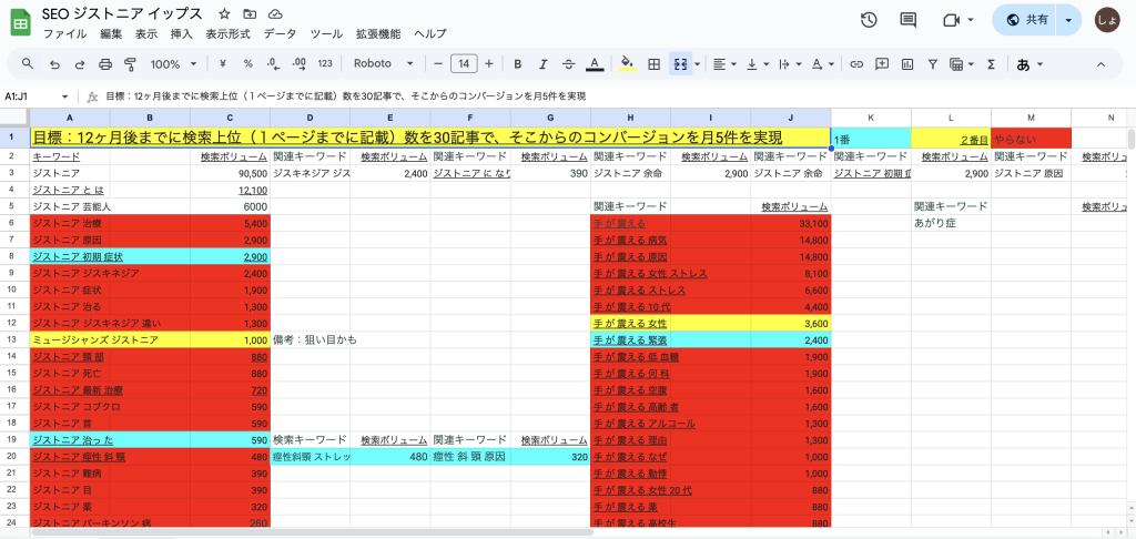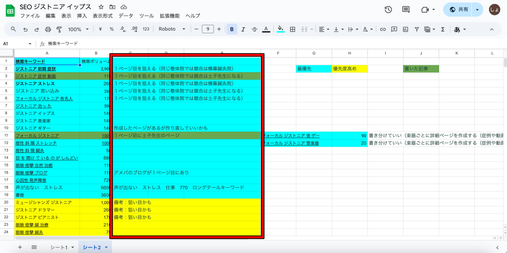 3、グーグルのスプレッドシート(選出したキーワードを表にするツール)