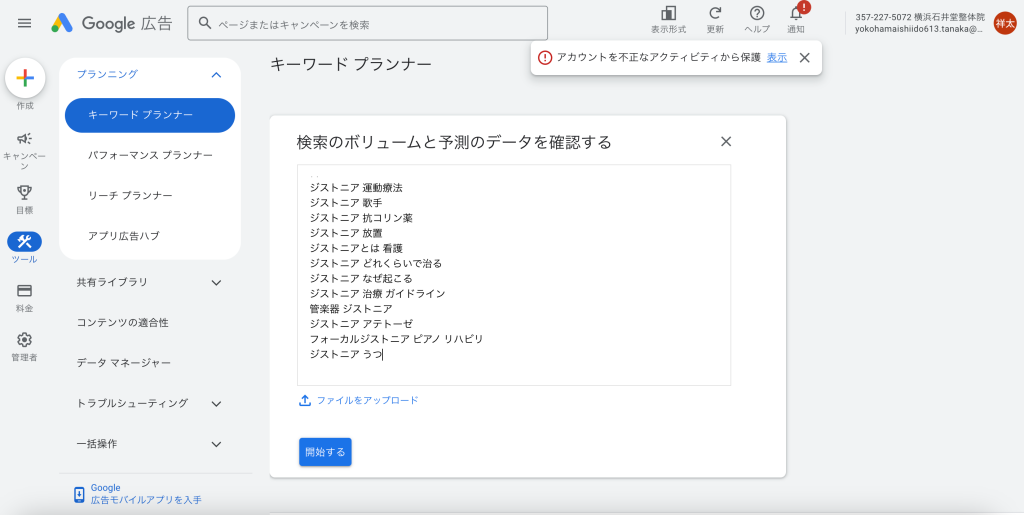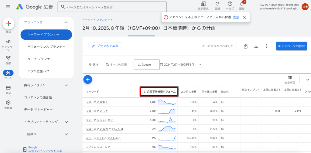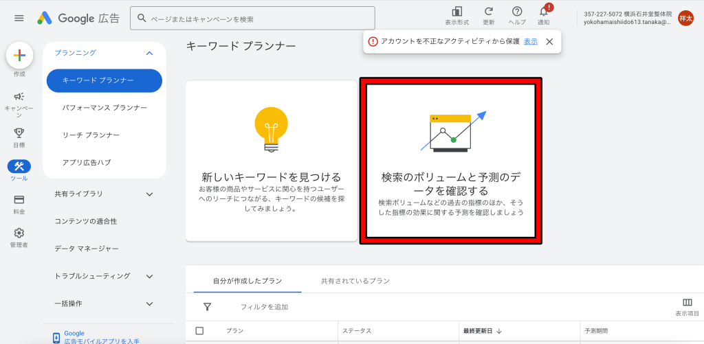 2、グーグルのキーワードプランナー(検索ボリュームを調べるツール)
