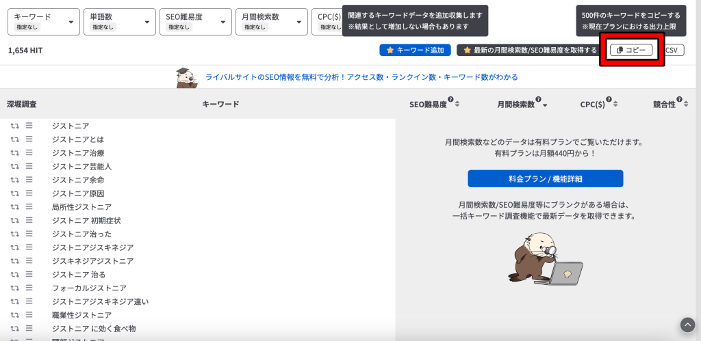 次にコピペした関連キーワードを含めた検索ワードが月間でどれくらい検索されているかを把握する。