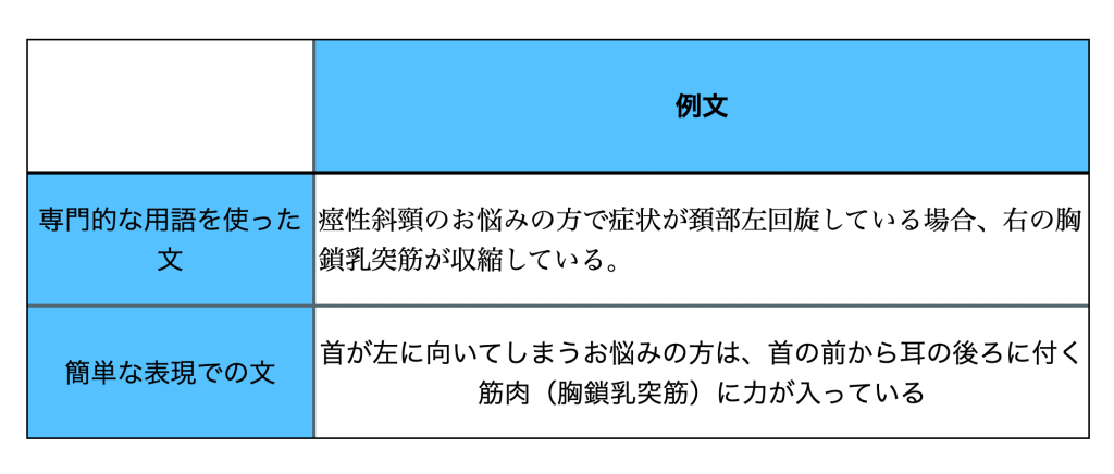 例:「痙性斜頸による動きの制限、痛みがあると毎日生活がとても苦しいですよね。その辛さから解放されるストレッチの方法が…」となる。