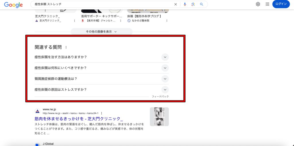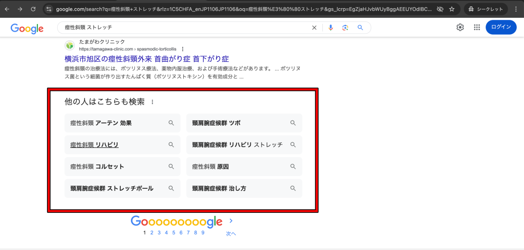 例えば、「痙性斜頸 ストレッチ」と検索して「他の人はこちらも検索」は画像の通りだ。